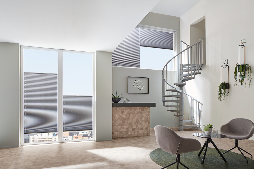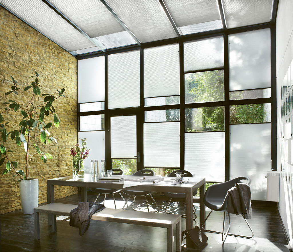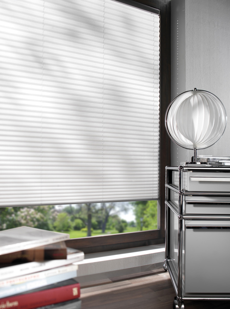 Plissee-Systeme gehören zu den vielseitigsten Innenbeschattungs-Systemen, da das Sortiment an Formen und Bedienungsarten für nahezu jede Anwendung die richtige Lösung bereithält. Plissee-Systeme haben ein geringes Gewicht, sind leicht zu bedienen und werden im Interesse der Wärmesteuerung nahe am Fenster montiert. Bei geöffneten Systemen sorgen die schmalen Lamellenpakete für maximale Sicht. Silent Gliss bietet eine breite Palette an unifarbenen, gemusterten und energieeffizienten Stoffen, die sich mit unterschiedlichsten Varianten des Systems kombinieren lassen.