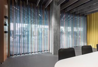 Eigens für "The Circle" entwickeltes System: zwei parallel geführte Elektrozug-Systeme mit gespannten, horizontal verschiebbaren Vorhängen, Colorama 1 oder 2. Raumtrenn-Systeme SG 6100 in den Besprechungsräumen.